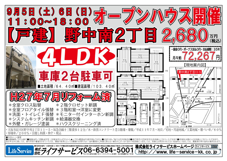 9月5日(土)6日(日)『野中南2丁目戸建』にてオープンハウスを開催いたします。
