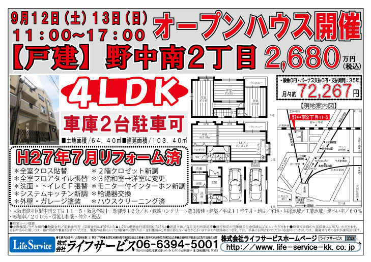 『野中南2丁目戸建』にてオープンハウスを開催いたします。