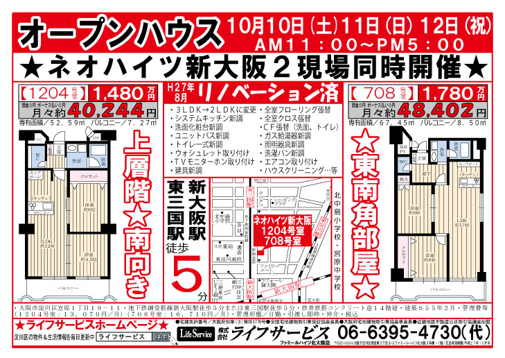 10月10日(土)11日(日)12日(祝)『ネオハイツ新大阪』『ファミールハイツ北大阪2号棟』『ファミール北大阪リンクス』にてオープンハウスを開催いたします。
