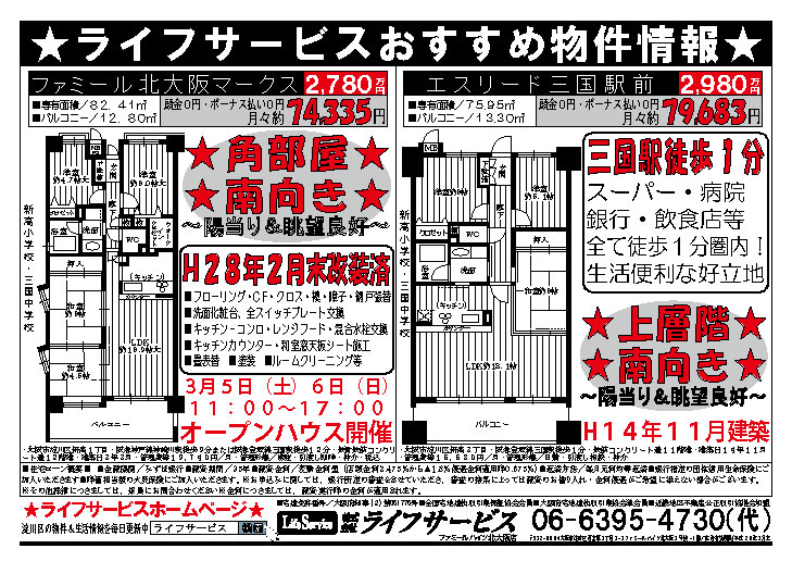 3月5日(土)6日(日)「ファミール北大阪マークス」にてオープンハウスを開催いたします。チラシを掲載しております。ごゆっくりご覧ください。