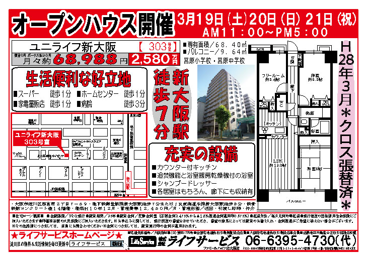3月19日(土)20日(日)21日(祝)「ユニライフ新大阪」にてオープンハウス開催致します。
