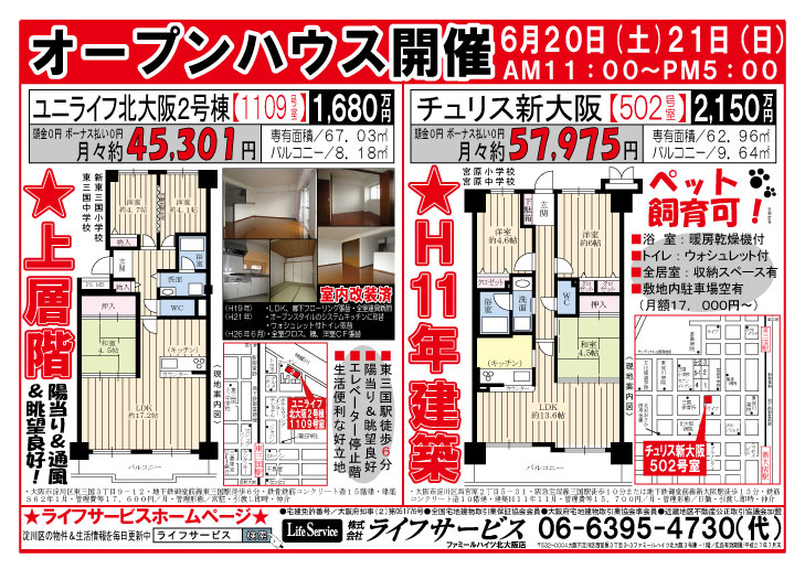 6月20日(土)21日(日)『ユニライフ北大阪2号棟』『チュリス新大阪』にてオープンハウスを開催いたします。
