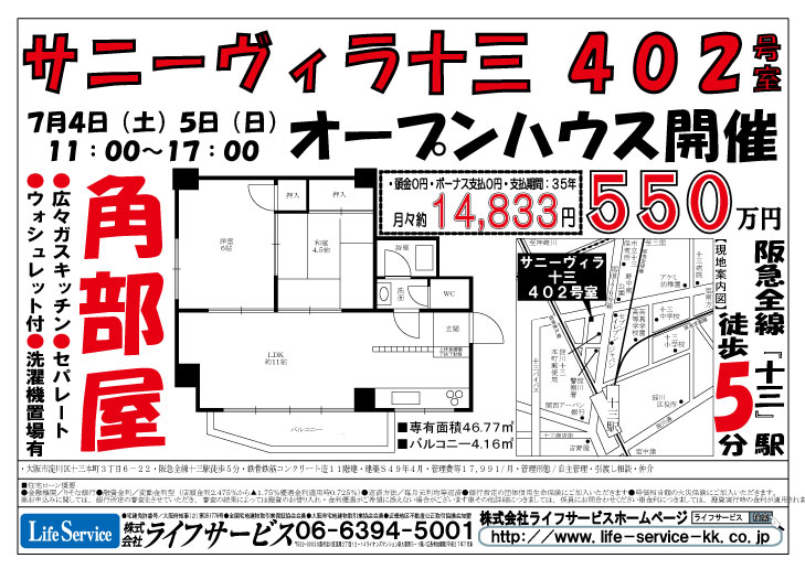 7月4日(土)5日(日)『ユニライフ北大阪2号棟』『チュリス新大阪』『アローマ伊丹』にてオープンハウスを開催いたします。チラシを公開しております。ごゆっくりご覧ください。