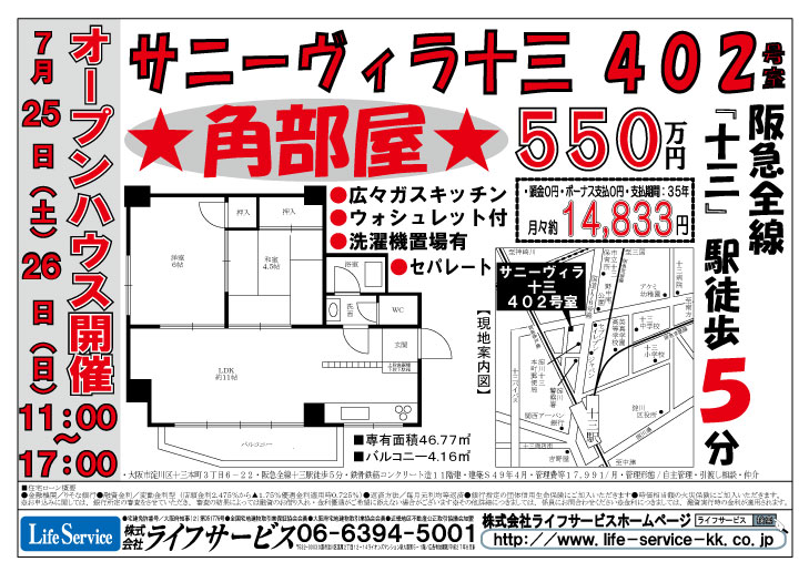 7月25日(土)26日(日)『ユニライフ北大阪2号棟』『グリーンハイツ十三』『アローマ伊丹』にてオープンハウスを開催いたします。チラシを公開しております。ごゆっくりご覧ください。