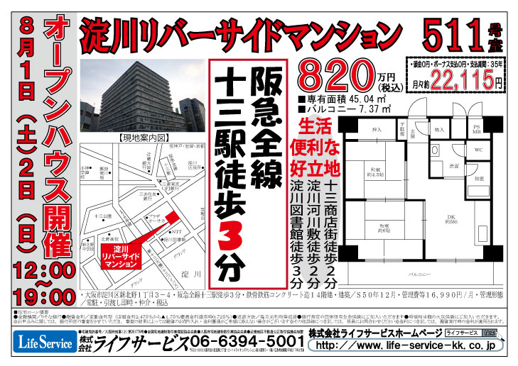 8月1日(土)2日(日)『淀川リバーサイドマンション』にてオープンハウスを開催いたします。